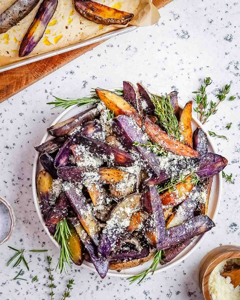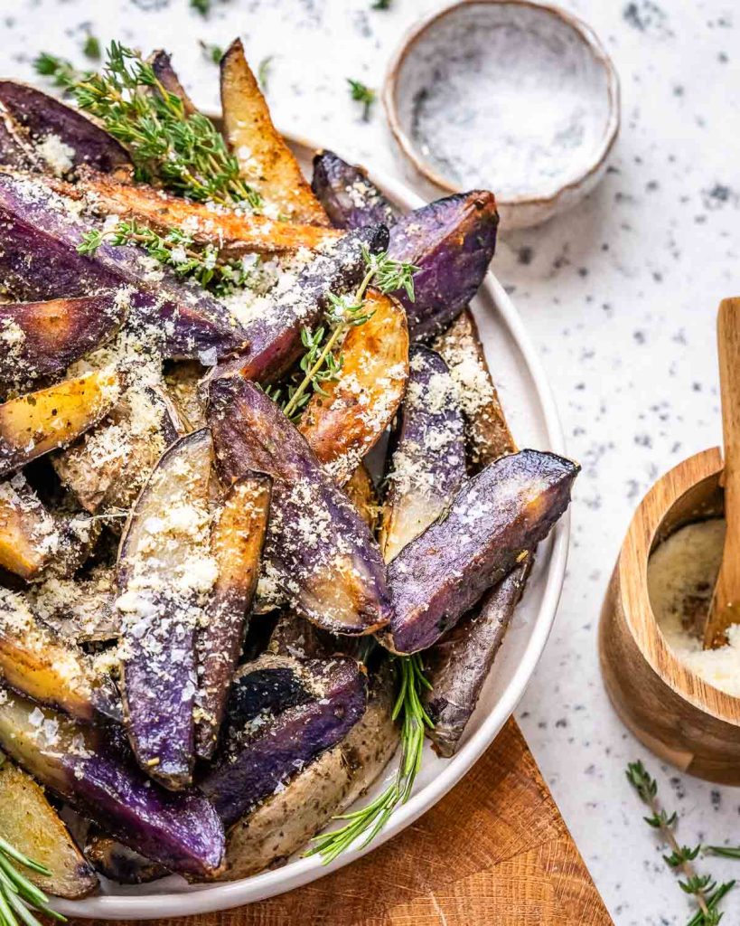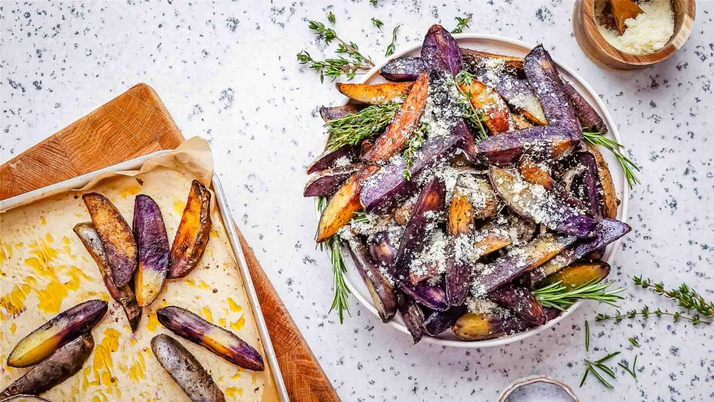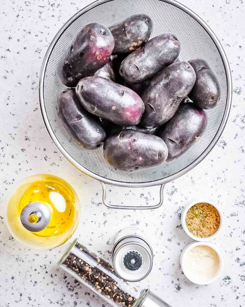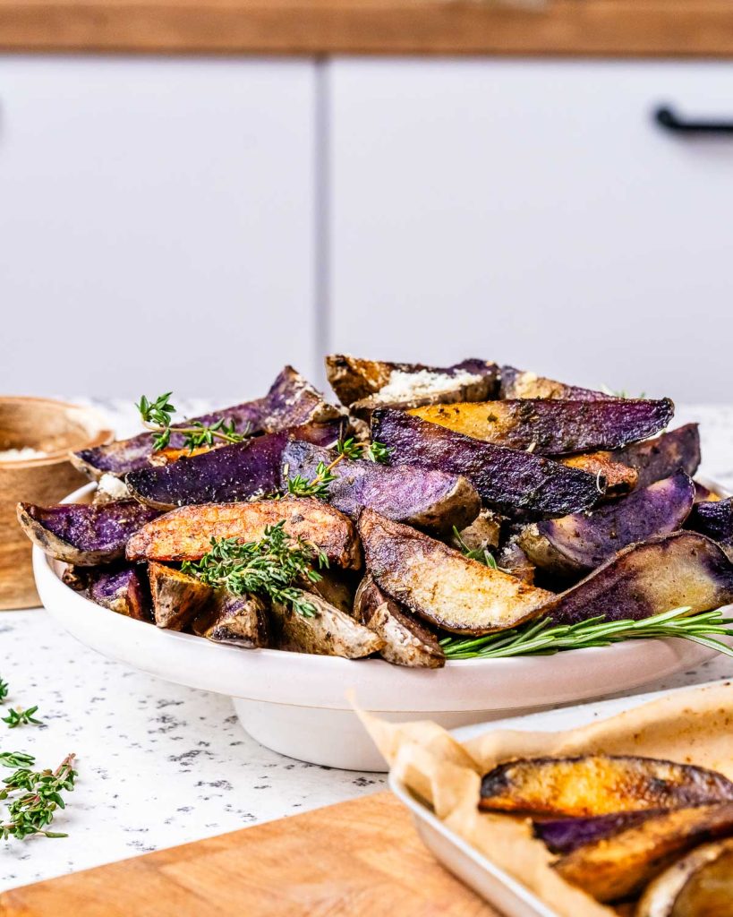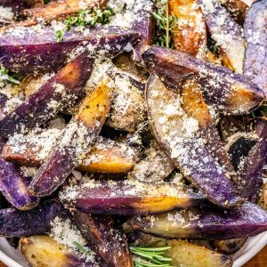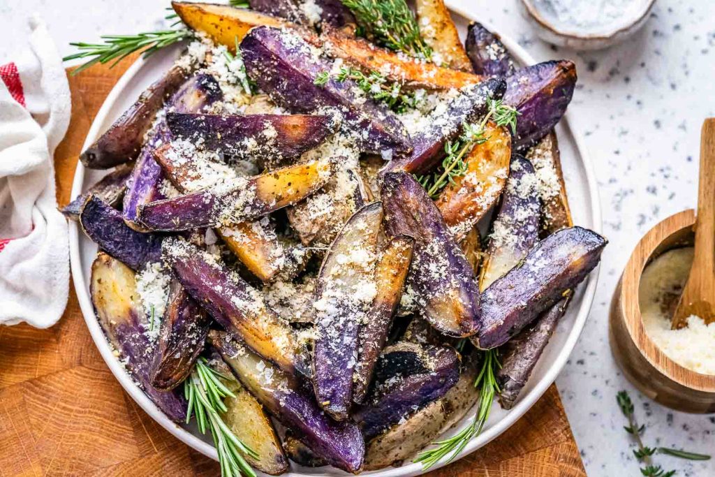 - 3 lbs purple potatoes, scrubbed and sliced into wedges