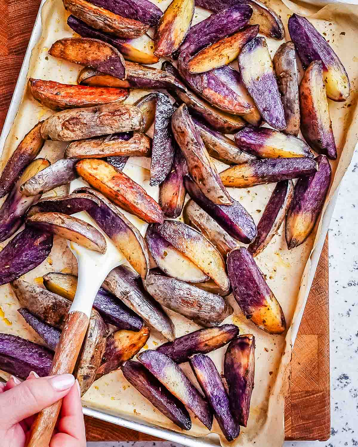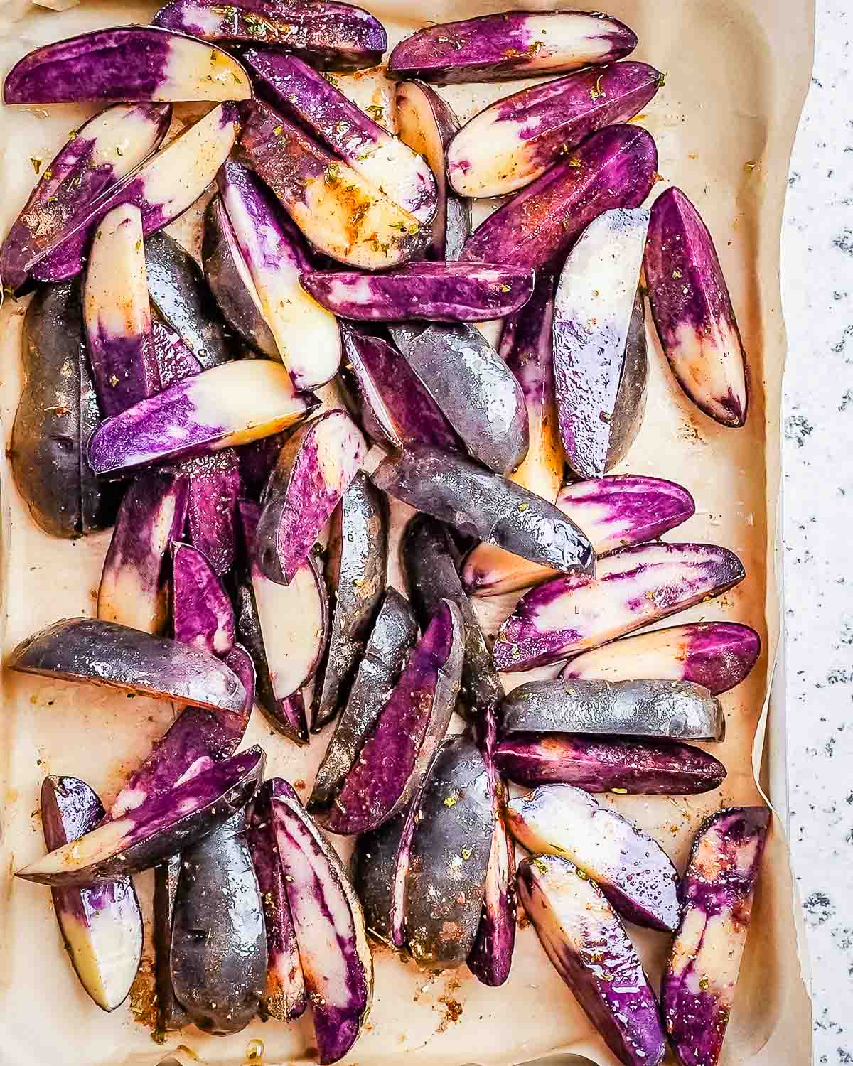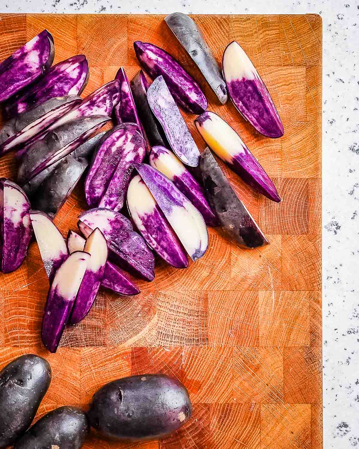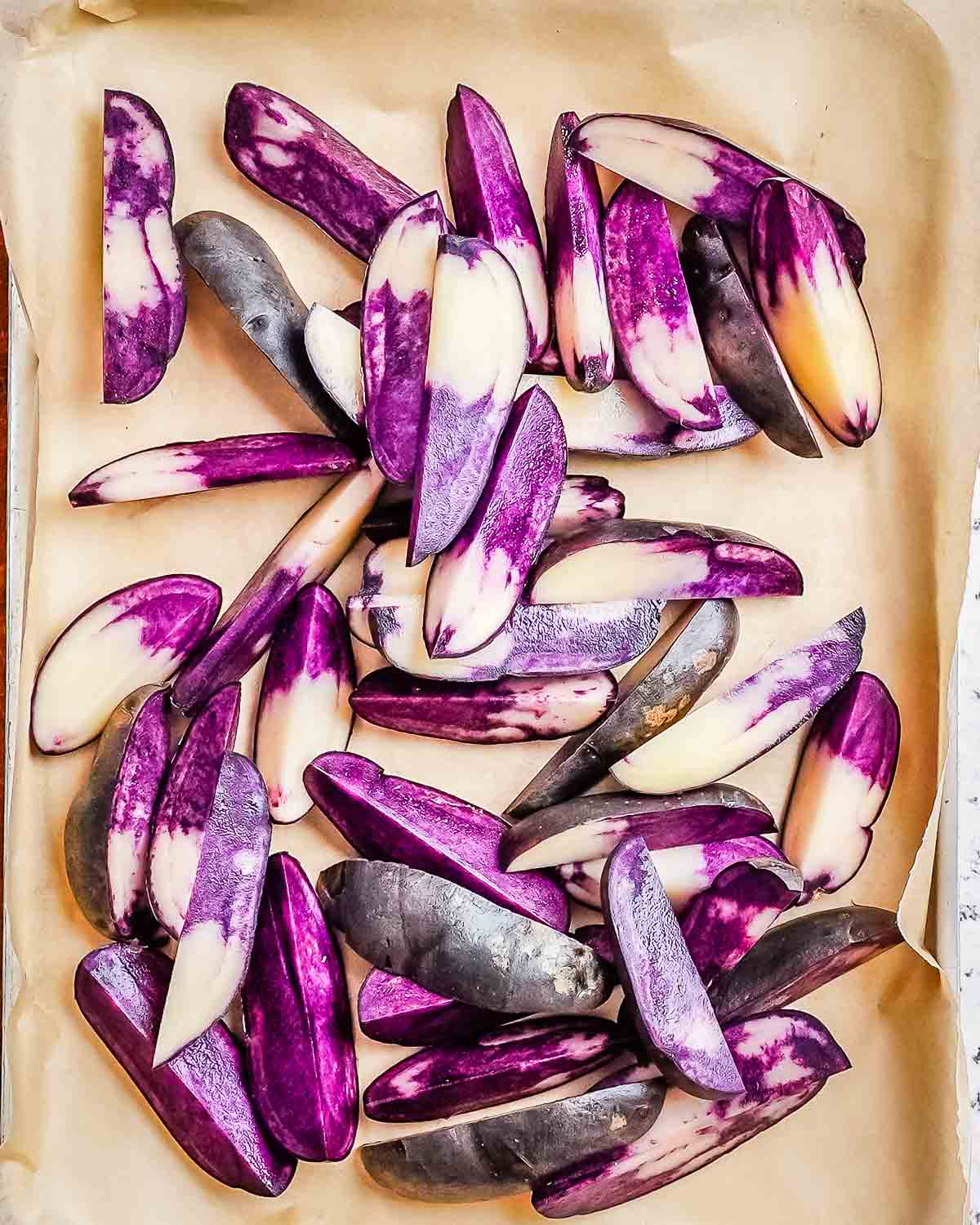 - 3 lbs purple potatoes, scrubbed and sliced into wedges