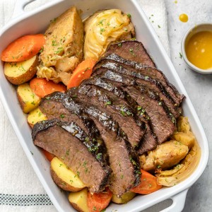 Brisket is naturally comprised of a lot of tough connective tissue. So I recommend cooking it using LOW heat for a long time (“low and slow”) to break down that tissue for ultra-tender results. This is why a slow cooker is an ideal cooking method!