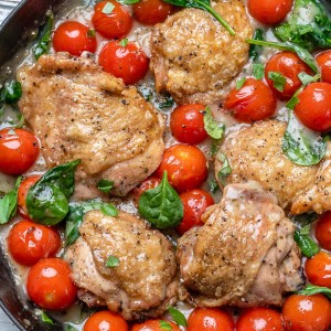 Herb and garlic *perfectly* seasoned chicken thighs, nestled in a creamy, buttery sauce with tender spinach and sweet-bursting cherry tomatoes.