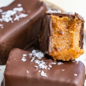Dip each caramel piece into your melted chocolate and sprinkle with a bit of flaky salt. Set back in the freezer for 10 minutes to firm up.
