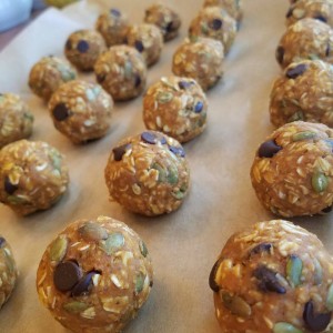 Though-roughly combine all ingredients together in a large bowl. Roll into balls of about 1″ in diameter (mine were a bit larger).