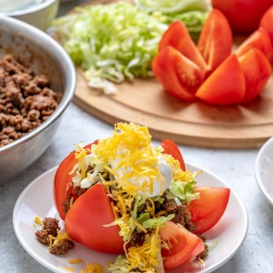 Perfectly seasoned grass-fed beef taco meat carefully spooned inside juicy-ripe tomatoes and topped with all your favorite stuff!