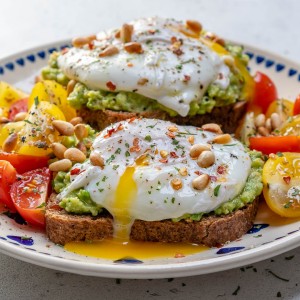 - Gently place the poached eggs on top of the avocado, then add cherry tomatoes, pine nuts and season to your liking.