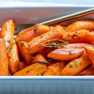 - Once the carrots are fork tender and beautifully golden browned, remove from the oven and transfer to a serving dish.
