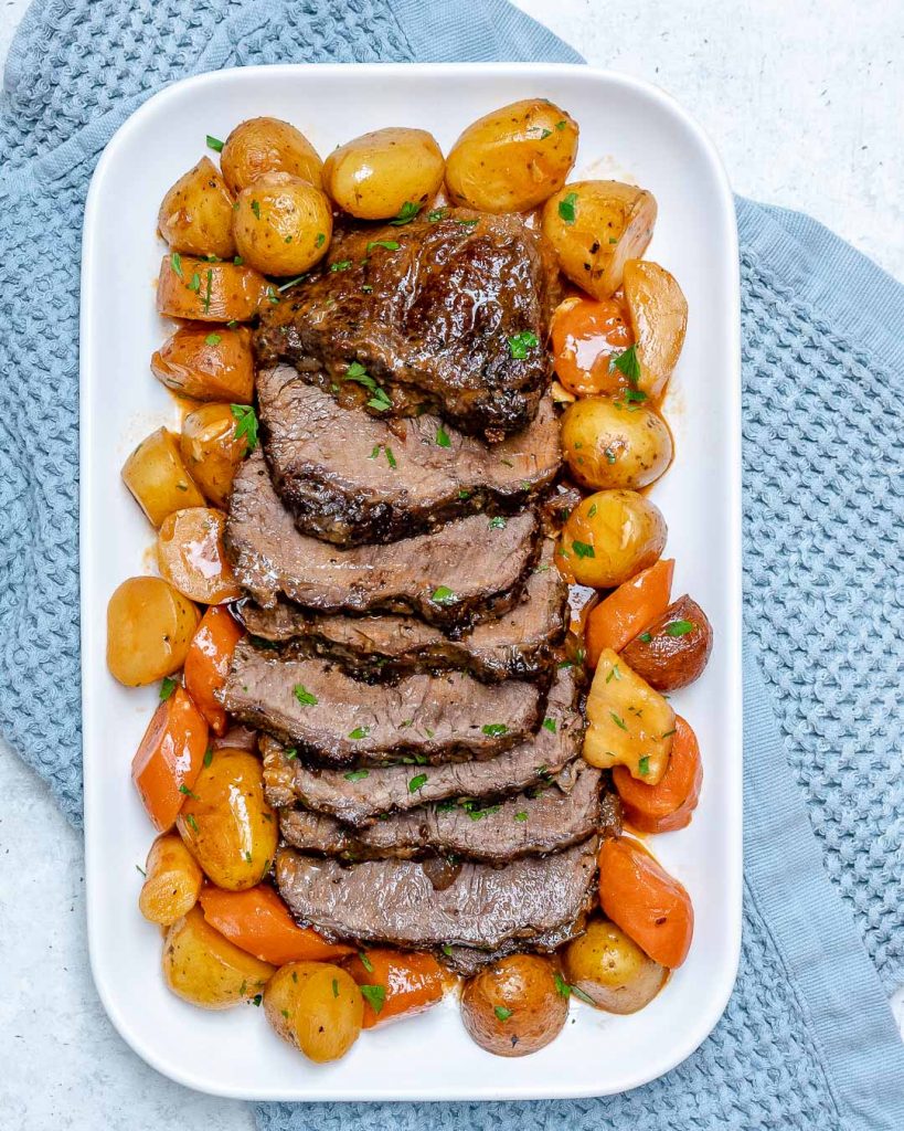 Once finished cooking, remove the roast and veggies from the cooker and place it on a large platter. Allow roast to rest 10-15 minutes before carving.