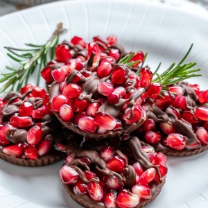 The pith will float and the seeds will sink, so remove the pith and discard, then drain the seeds. Gently pat dry seeds with paper towels. Scoop about 2 teaspoonfuls of melted chocolate into each cup.Top the cups with a spoonful of pomegranate arils.Then, using a spoon, swirl melted chocolate all over the seeds, as shown. Allow to sit in your refrigerator for 15 minutes, until the chocolate sets. Pop them out of the tin, unwrap and arrange on a large platter. Decorate with rosemary sprigs for a festive touch.These stay good, kept in the fridge for up to 3 days.
