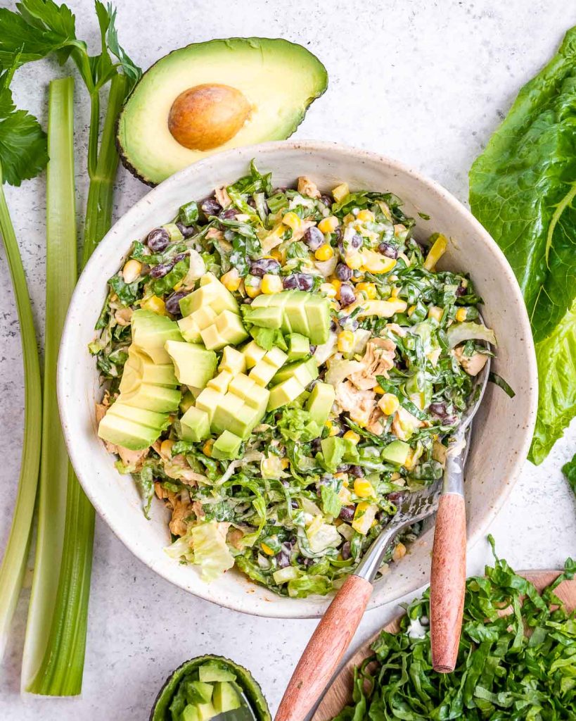 In a large salad serving bowl, add the romaine, chicken, pepper, beans, corn, celery, onions, and cilantro.