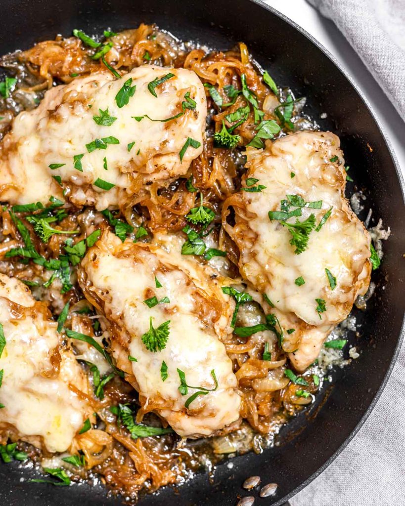 This French Onion-Chicken makes for a great meal prep idea as well. Store in sealed containers for up to 4 days in the fridge.
