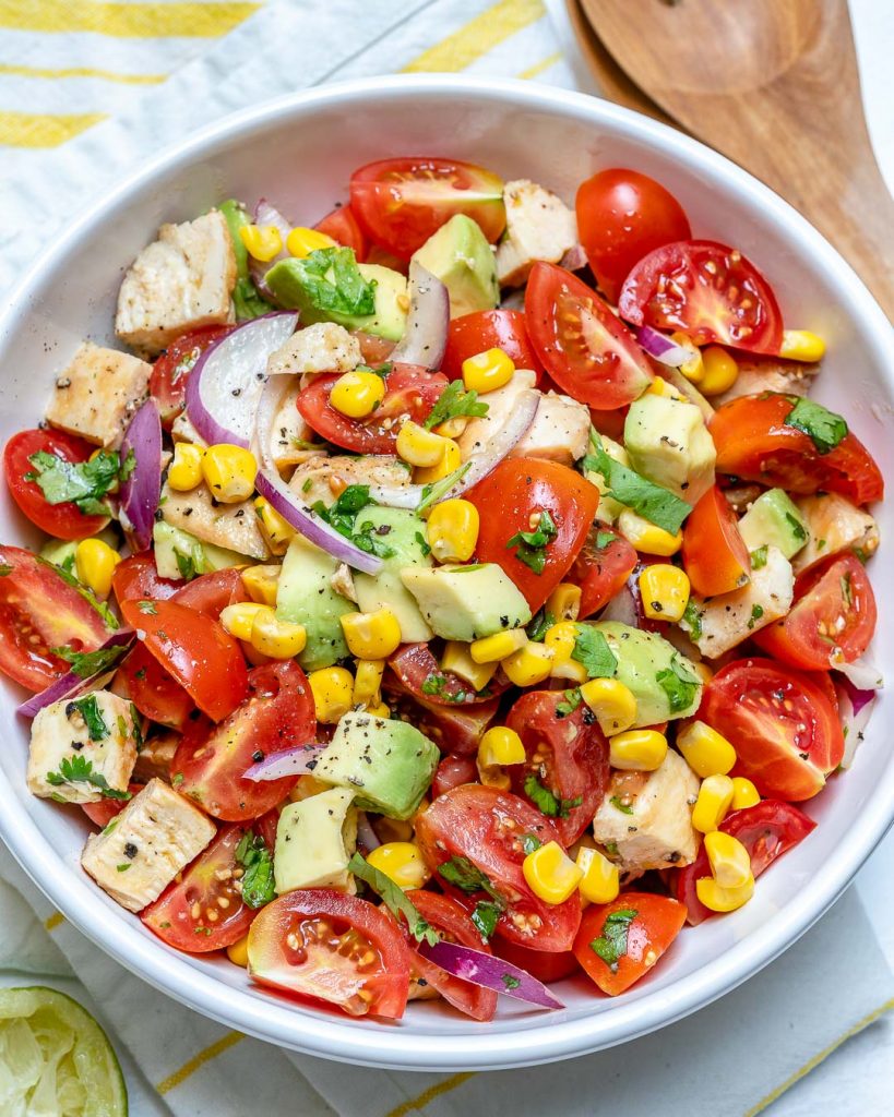 In a large bowl, add in your cubed chicken together with tomatoes, avocado, onion, cilantro, and corn.
