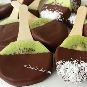- Dip frozen Kiwi in the melted chocolate. They harden almost immediately.