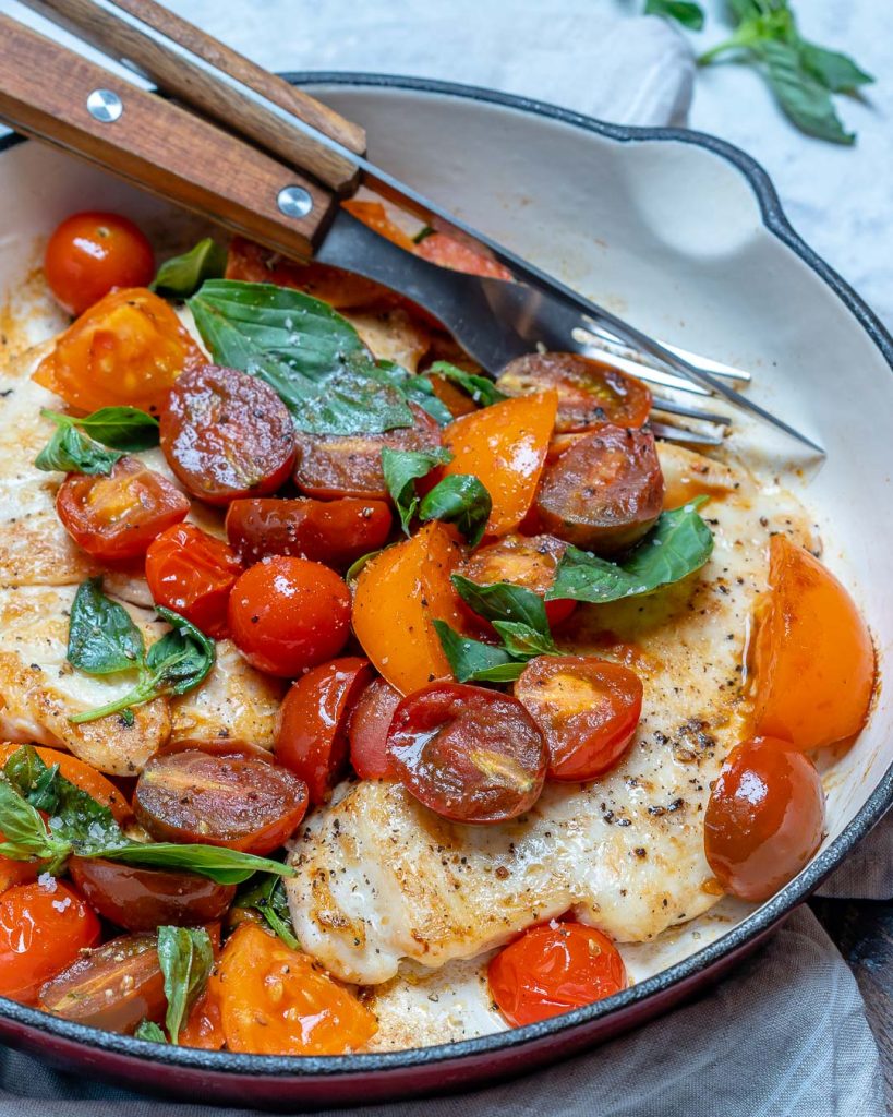 This dish is a symphony of simple flavors and textures, featuring tender and juicy chicken, sweet and tangy tomatoes, and a sprinkle of fresh basil for added brightness.