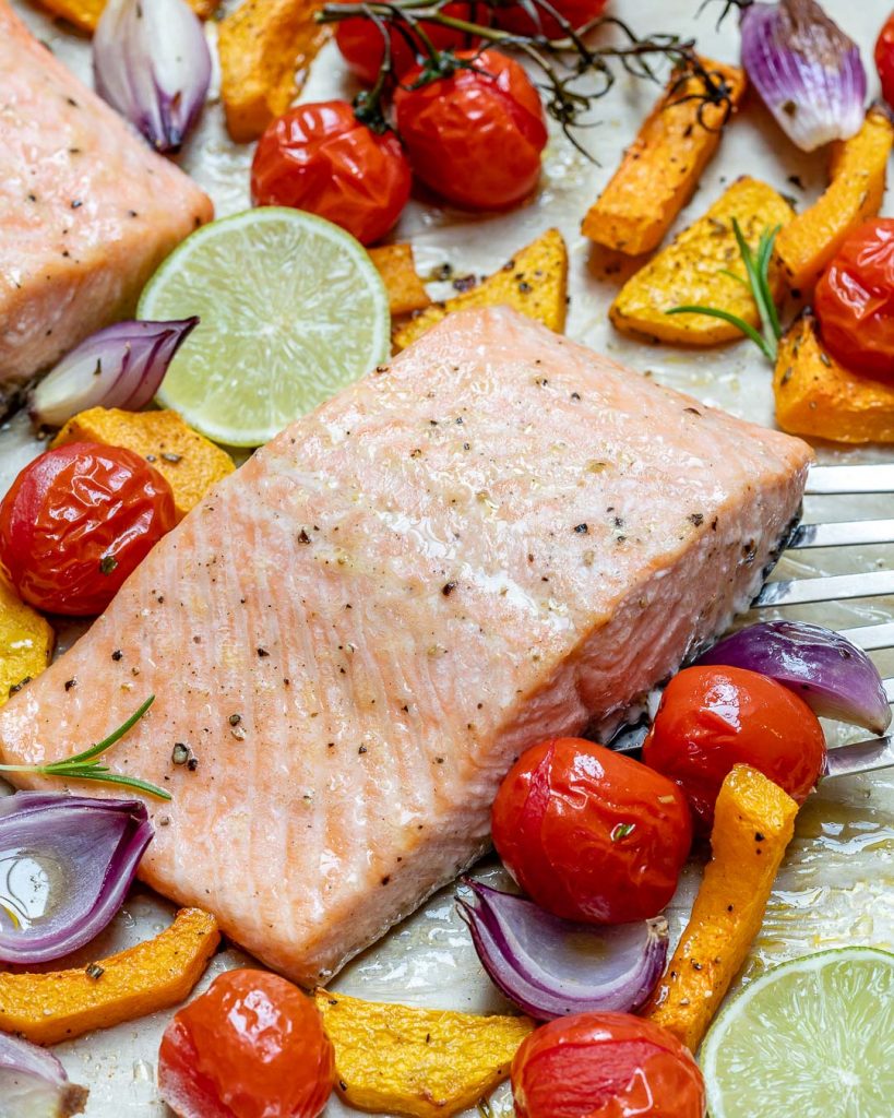 Garlic Lime Salmon + Butternut Squash Tray Bake