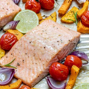 Garlic Lime Salmon + Butternut Squash Tray Bake