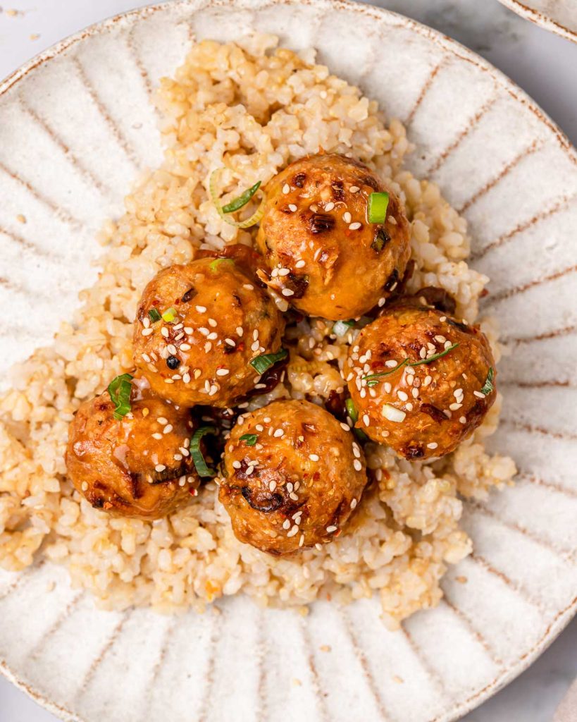 I served these perfectly tender saucy meatballs over brown rice, but they would also be great served over cauliflower rice, quinoa, or mashed potatoes too!