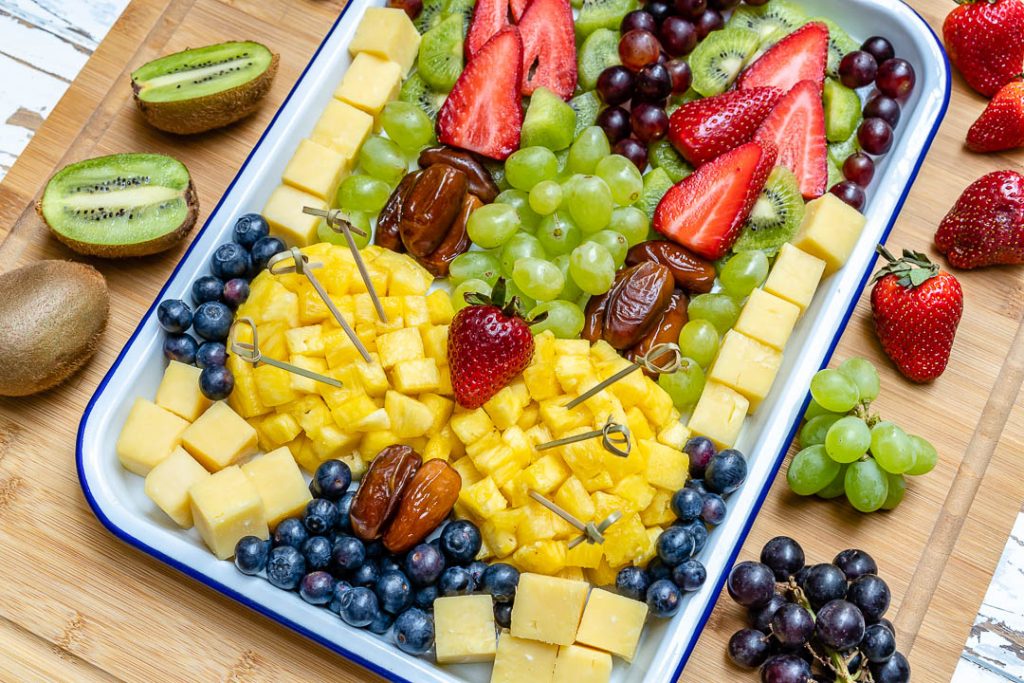 - Add cheese cubes on the sides of the platter, and fill the remaining space with blueberries.