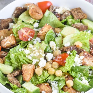 Greek Inspired Chicken Salad with Tahini Vinaigrette and Homemade Croutons