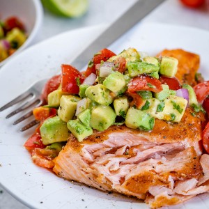 - Once the salmon is done cooking, serve it warm topped with your avocado salsa.