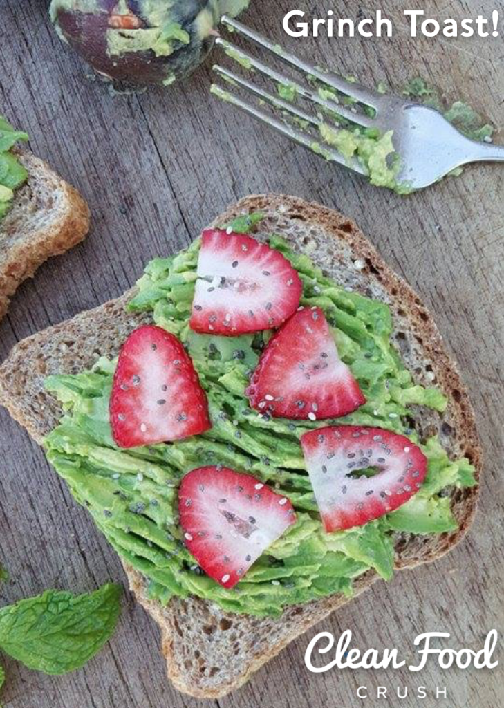 Grinch Toast – Ezekiel Bread with Avocado, Strawberries, & Chia Seeds