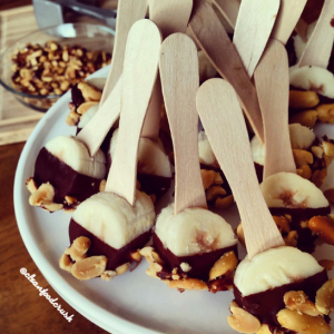 - Dip bananas lightly into melted chocolate, immediately dip chocolate covered banana into Peanuts-pressing lightly.