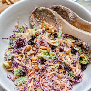 In a large bowl, add crisp-tender broccoli, cabbage, carrots, almonds and cranberries. Pour in your dressing and gently toss to combine. Taste test, and adjust if needed.