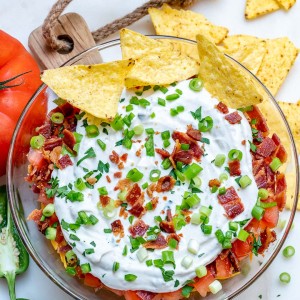 - Layer the beans in a glass see-through bowl or dish, then add the following layers: shredded cheese, chopped tomato, crumbled bacon and yogurt jalapeño mixture.