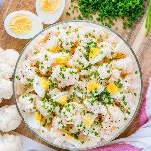 - In a large bowl gently stir the cauliflower, onion, celery, and egg together with the dressing. Gently toss, then sprinkle with chives or parsley.