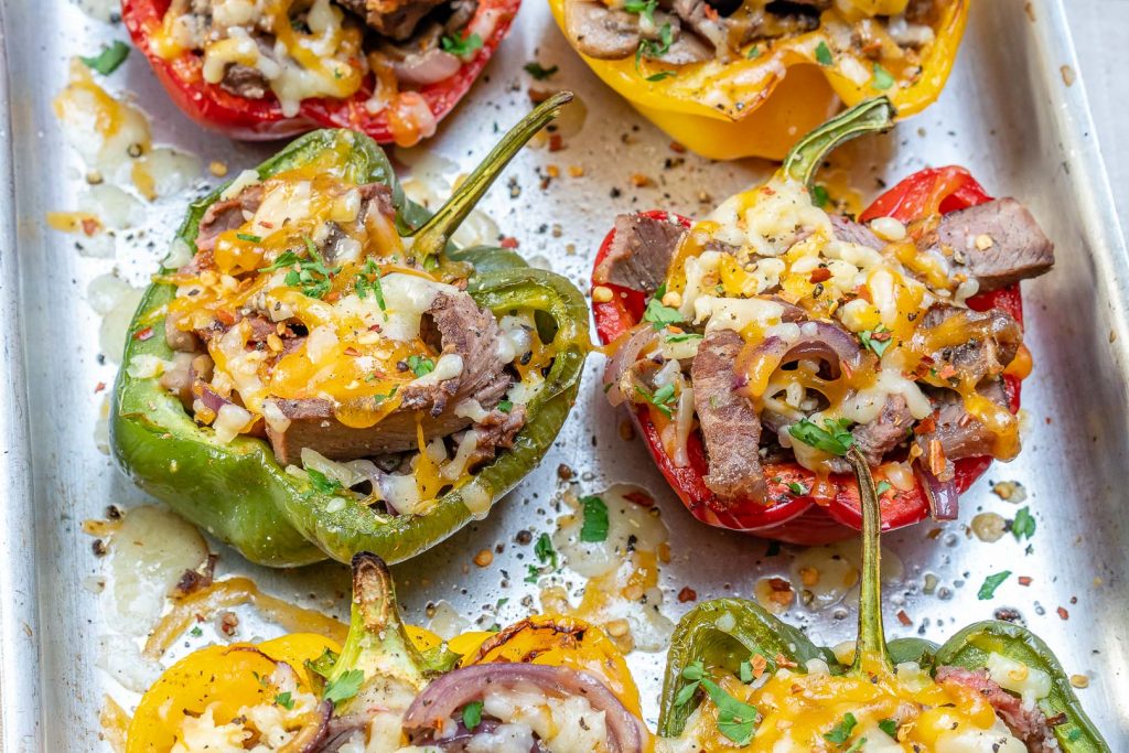 Sautéing the onions and mushrooms together really gives these low-carb, low-cal stuffed peppers all the satisfying flavors of that traditional cheesesteak you’re craving!