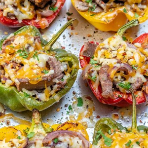 Sautéing the onions and mushrooms together really gives these low-carb, low-cal stuffed peppers all the satisfying flavors of that traditional cheesesteak you’re craving!