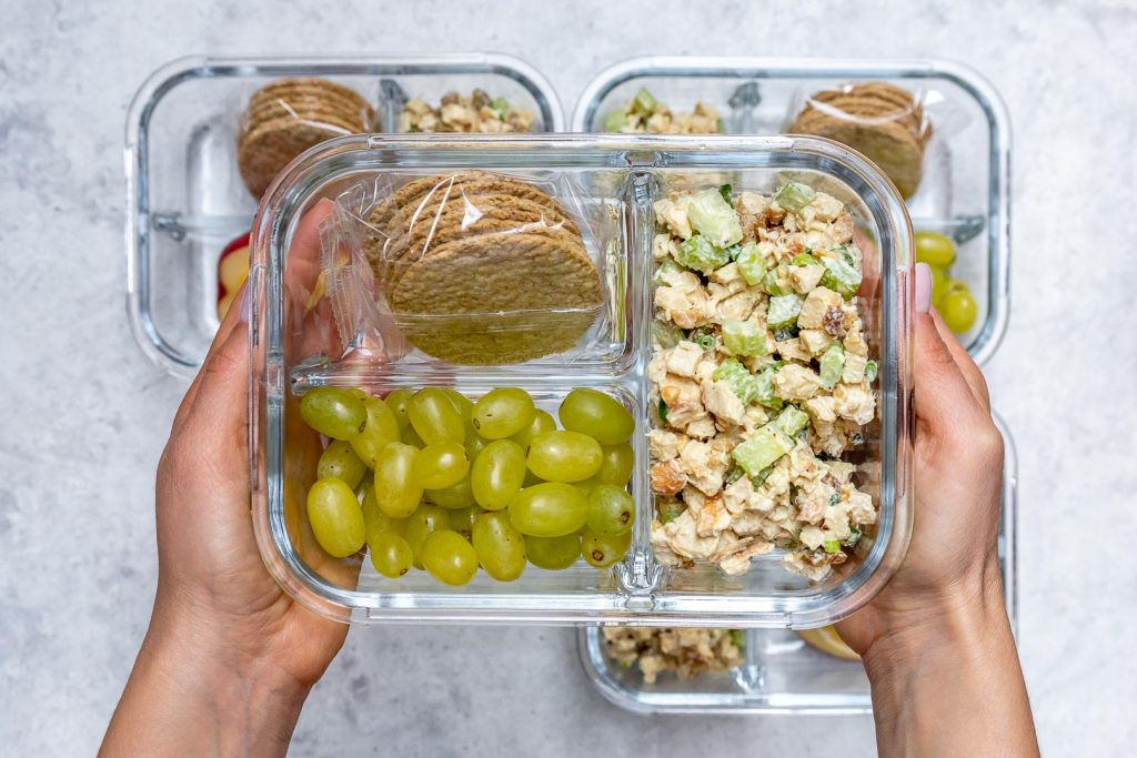 - Divide your chicken salad equally among 4 clean glass food prep/bento type containers, then add in some extras like half an apple (place a thin lemon slice on the cut side of the apple to keep it from browning), clean grapes and oatmeal crackers (keep the crackers unopened in a bag to avoid getting soggy).