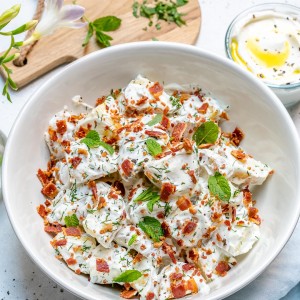Very gently stir to coat. Taste test, and adjust seasonings if you like. Sprinkle with crumbled bacon, any extra fresh herbs, and fresh ground black pepper. Serve immediately, or refrigerate up to 24 hours before serving.