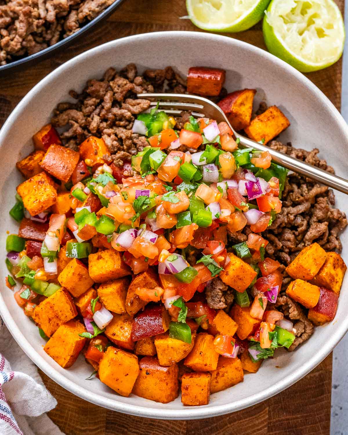 With lean ground beef, crispy taco-seasoned sweet potatoes, and everyone’s favorite fresh pico-style salsa, this recipe is a perfect balance of protein, healthy fats, and fiber-rich complex carbohydrates.