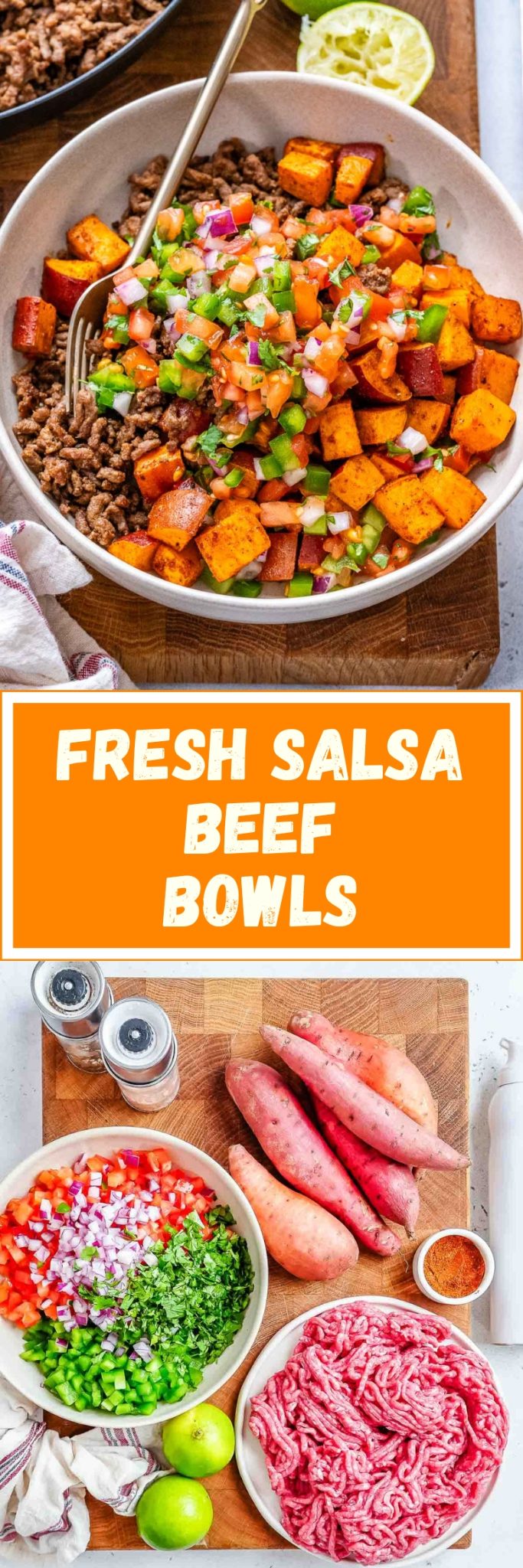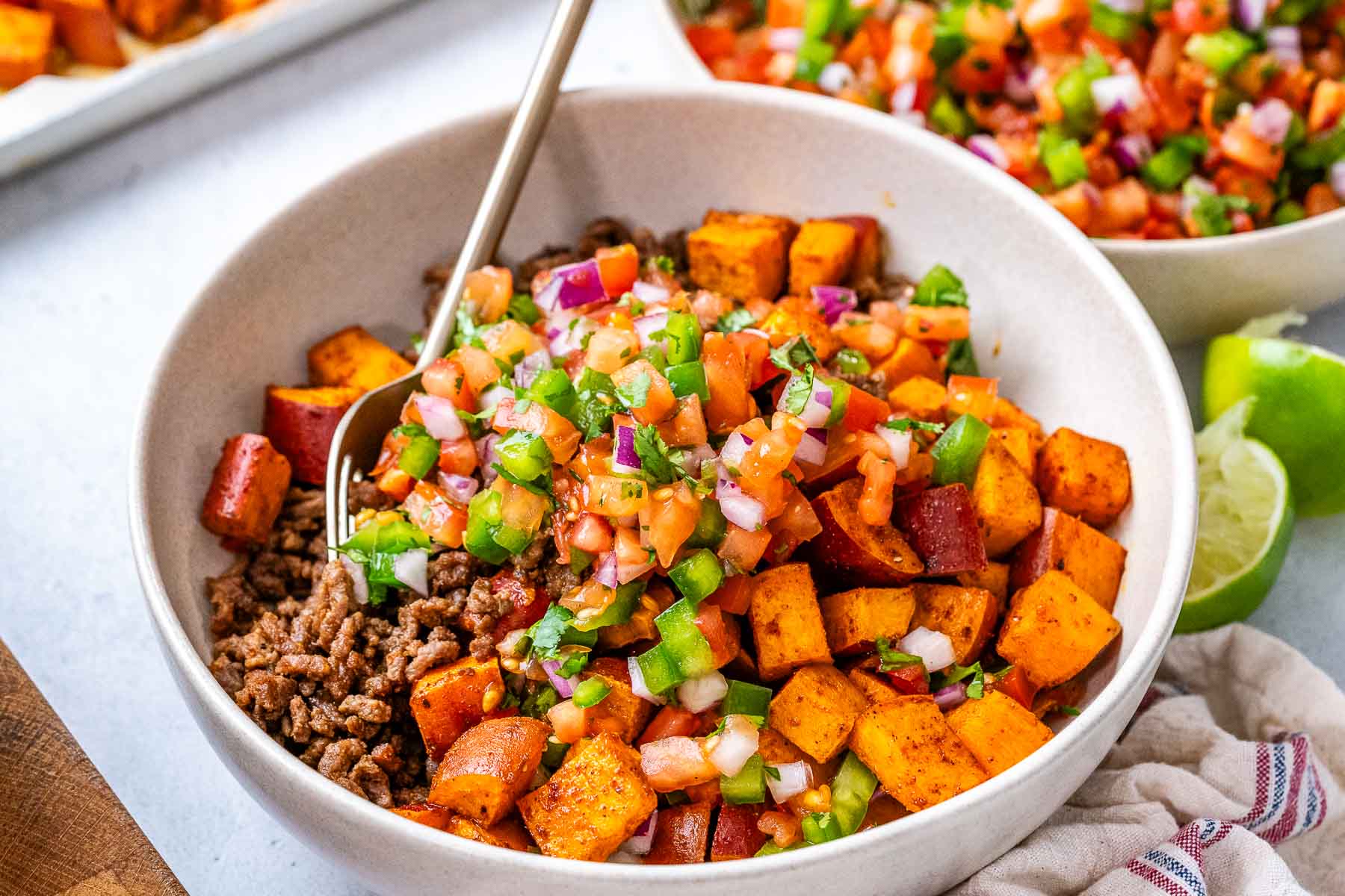 This healthy ground beef bowl contains well seasoned ground beef, tender roasted sweet potatoes, and a bright, freshly made pico de gallo. Ready in under 40 minutes, this high protein beef bowl is perfect for meal prep or an easy dinner, plus the kids will love that it’s customizable.