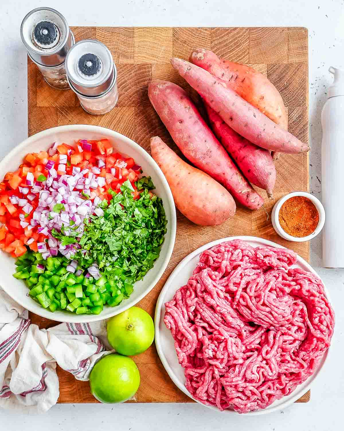 To make easy ground beef meal prep bowls, choose a day when you are free to make all the elements for the recipe. Roast the sweet potatoes, cook the ground beef, and make the pico de gallo per the recipe.