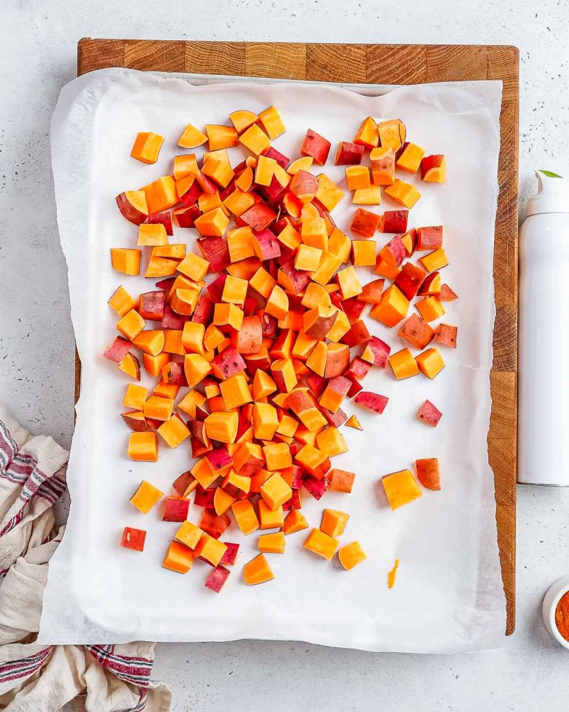 - Place your cubed sweet potatoes on your prepared sheet pan and toss with the taco seasoning and oil.