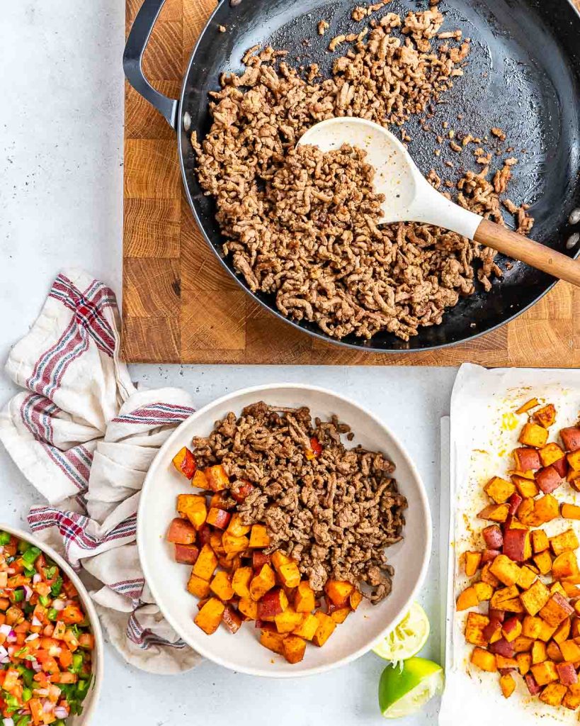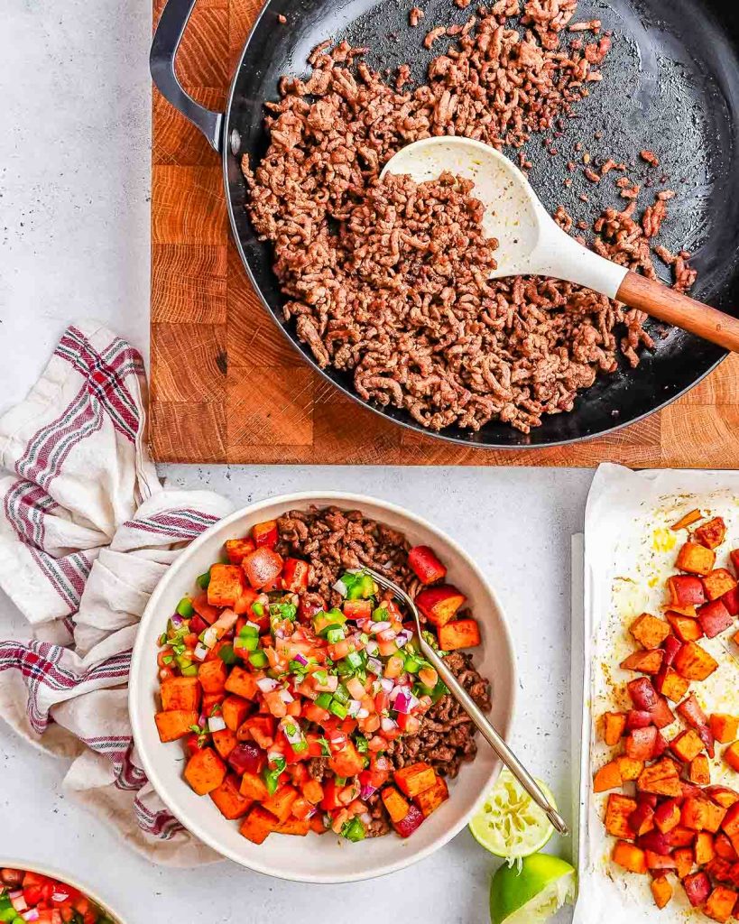 - Done in Under 40 Minutes!: This healthy ground beef recipe comes together in about 30 minutes. And if you prep ahead the roasted sweet potatoes and fresh pico de gallo, it could be as fast as 10 minutes.