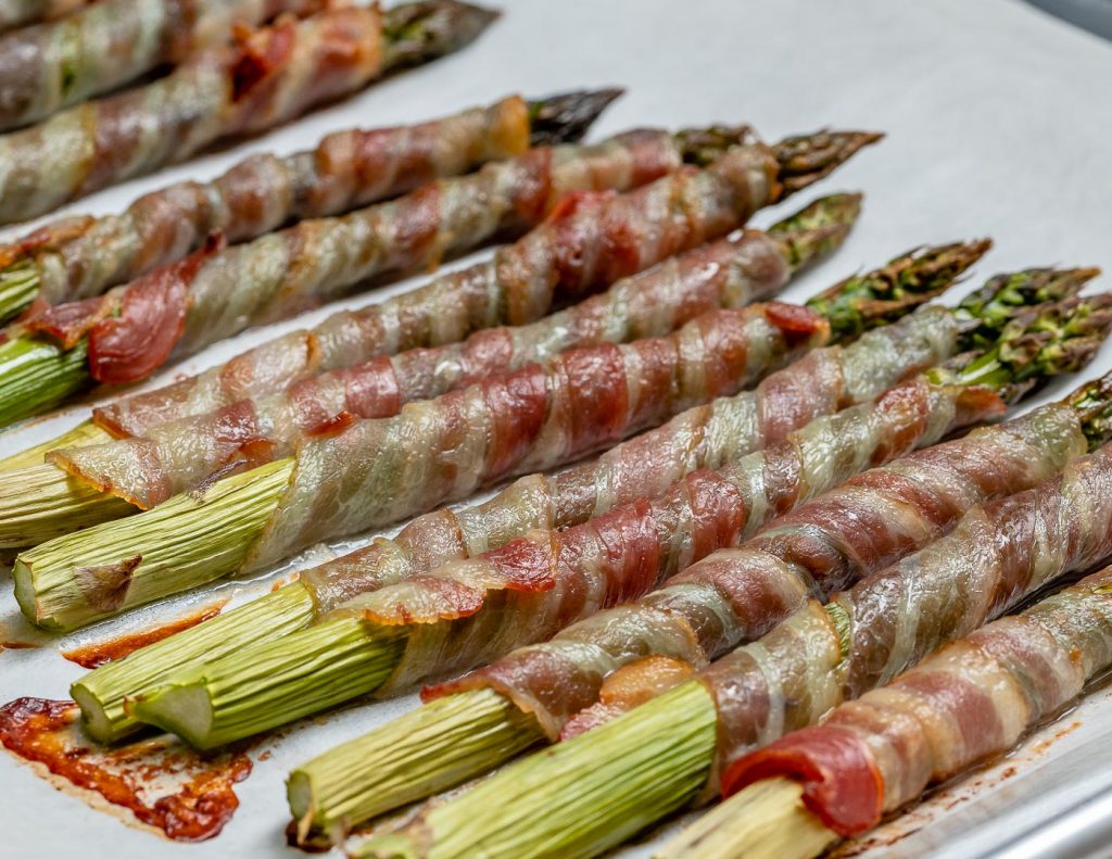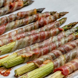 - Place your wrapped asparagus on the prepared baking sheet and repeat with remaining asparagus and bacon leaving space between each so that they can crisp up.