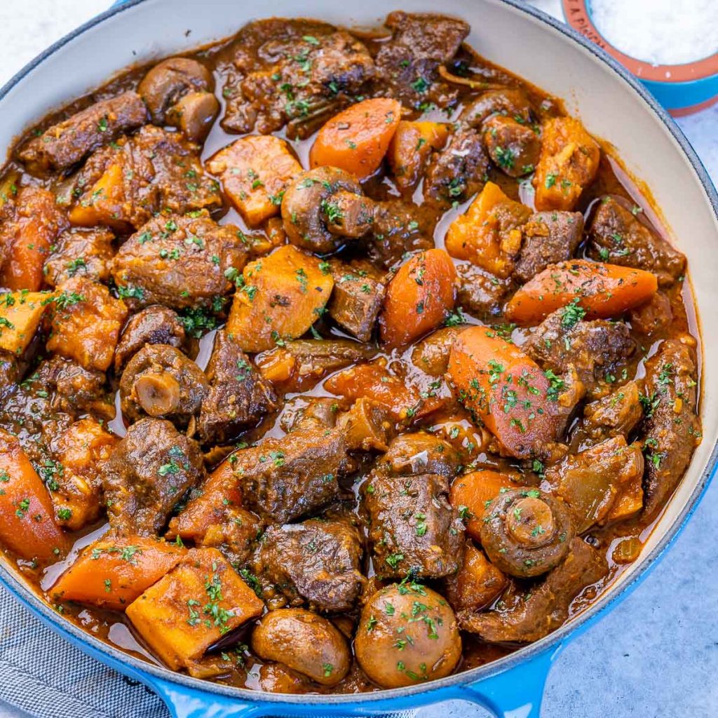- 2 lbs beef chuck stew meat, cubed into 1″ pieces