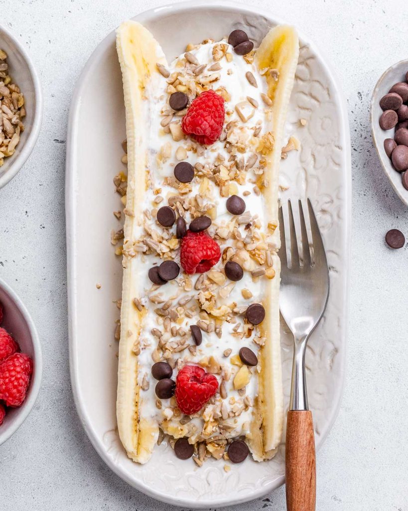 - Top the bananas with dollops of your protein-yogurt mixture and sprinkle with the hydrated nuts, fresh raspberries and chocolate chips.