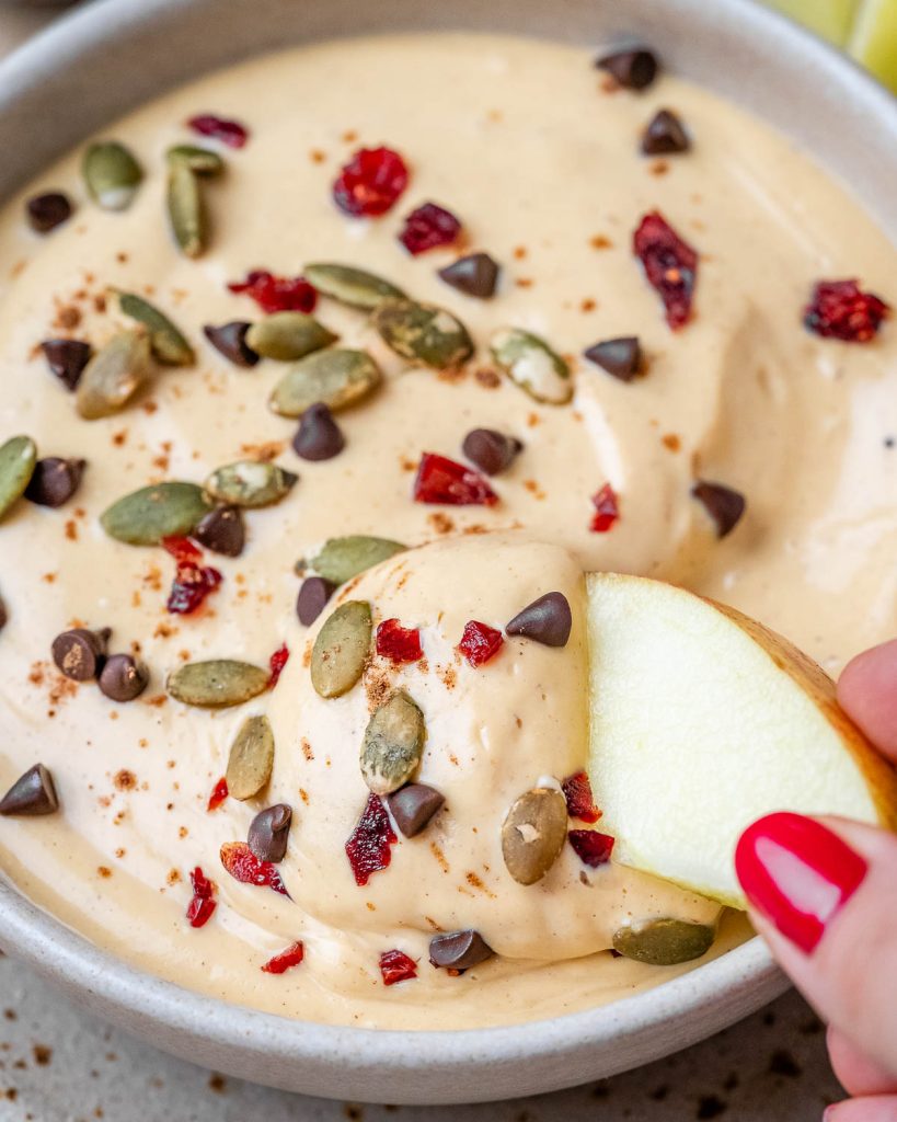 Enjoy this creamy dip with crunchy fruit, toasted pumpkin seeds, or dark chocolate chips. Your taste buds and your body will thank you!