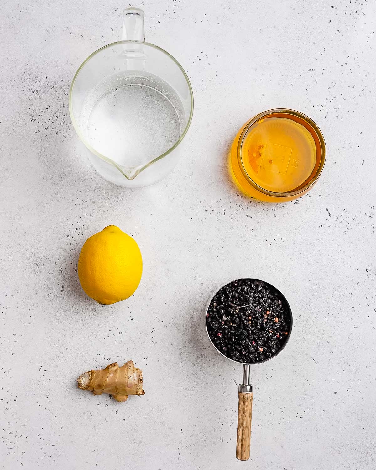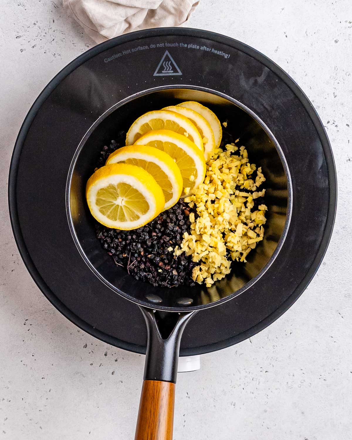 - Place your elderberries in a large saucepan. Add the lemon, ginger, and water.