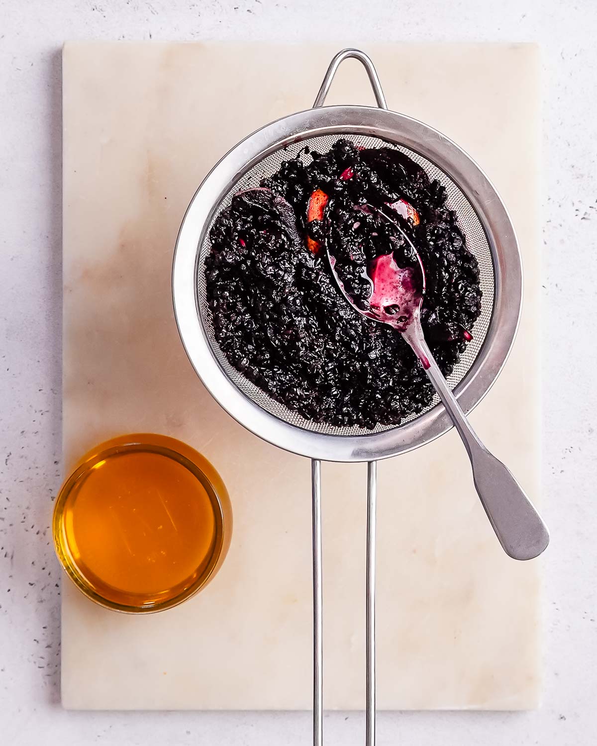 - Once cool, strain and reserve the liquid. Use the back of a spoon to gently push all of the valuable liquid out of the elderberries, so you get every drop.