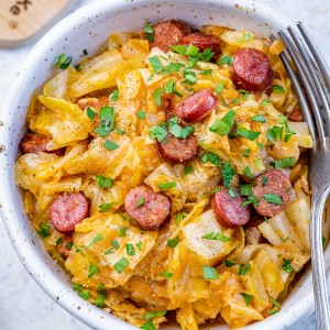 Cabbage is often on sale – so I try to grab some whenever it is to incorporate throughout our weekly meals. I happened to have this high-quality pepperoni that I needed to use, which became the “fun” part of this meal for my older kids. Any type of sausage works really well here if you don’t want to use pepperoni.