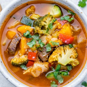 This Veggie + Beef Soup was a happy surprise one evening when I had purchased beef on sale and had a plethora of vegetables sitting in my kitchen to use up fast. Turned out REALLY good, and I LOVE that it’s totally packed with veggies and protein.