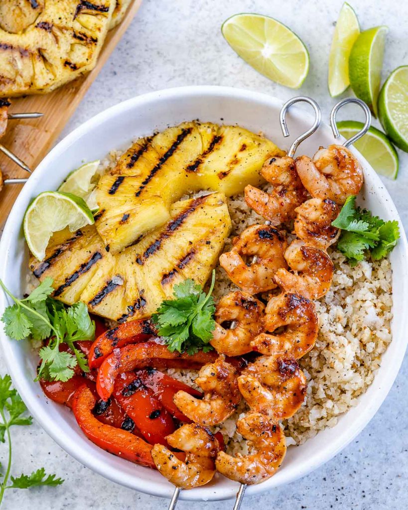 - To assemble your bowls, divide the cooked brown rice or cauliflower rice equally into 4 serving bowls. Top with the grilled bell peppers and pineapple. Serve with your shrimp skewers as shown.