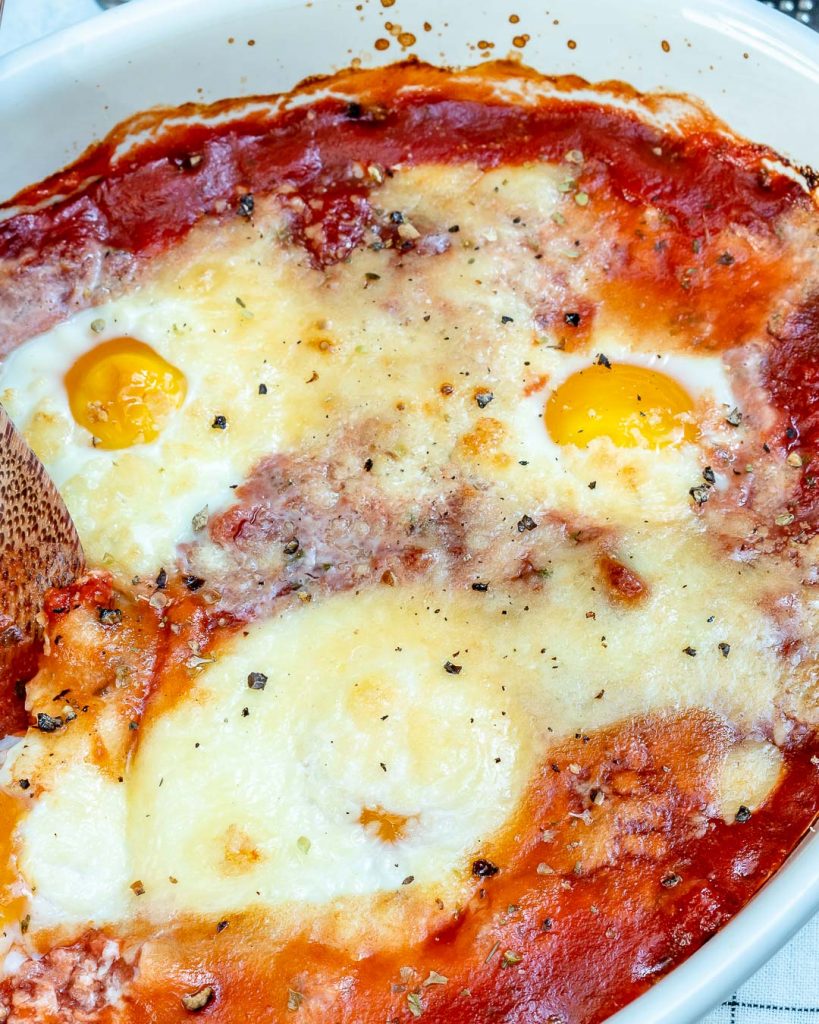 - Layer the marinara sauce into one medium sized baking dish or divide it among 4 small ones.
