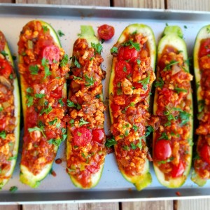 Place filled zucchini boats on a flat sheet pan. (parchment lined to prevent sticking)