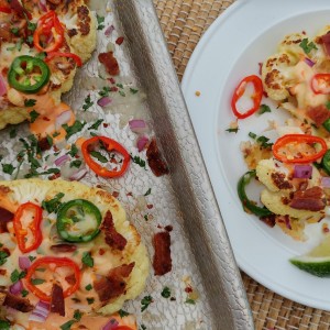 - Remove pan from oven, carefully top each cauliflower with Greek yogurt/wing sauce, and then divide up remaining toppings as desired.