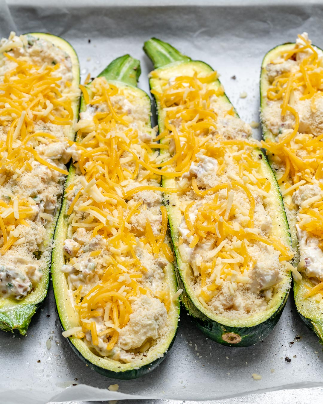 Season zucchini with sea salt and pepper and very lightly spray with oil. Bake for 15 minutes, or just until they begin to soften. Combine the reserved zucchini flesh back into your cream cheese mixture, and spoon into the zucchini boats.