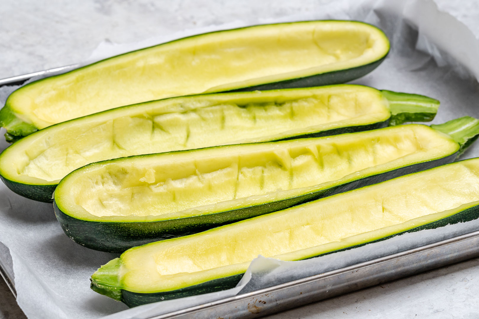Using a sharp knife, cut your zucchini in half lengthwise as shown. Next, using a small knife, score through the zucchini flesh, as shown. Scoop out the inside flesh leaving once zucchini boats, and reserve flesh for later. Place zucchini halves cut side-up onto your prepared baking sheet.